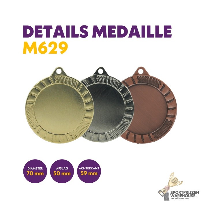 Deze medaille heeft een diameter van 7 cm, dikte van 2 mm en graveer ruimte aan de achterzijde van 59 mm.