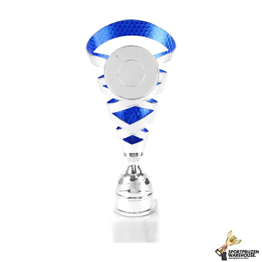 Leuke zilveren beker met een blauw accent. Deze trofee is beschikbaar in 3 hoogtes