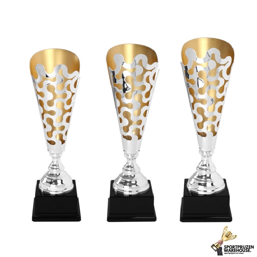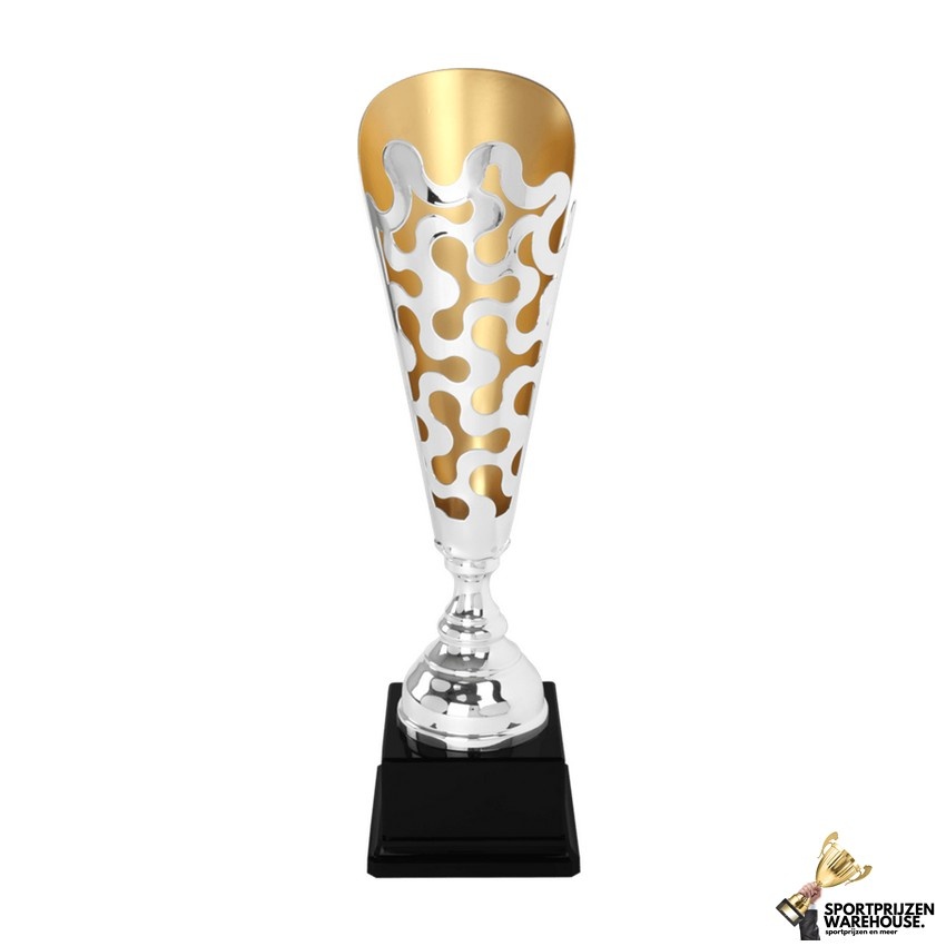 Deze luxe bokaal van zilver met een gouden accent kan voorzien worden van een gravering naar keuze en is beschikbaar in 3 hoogtes